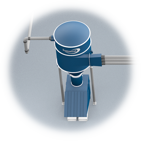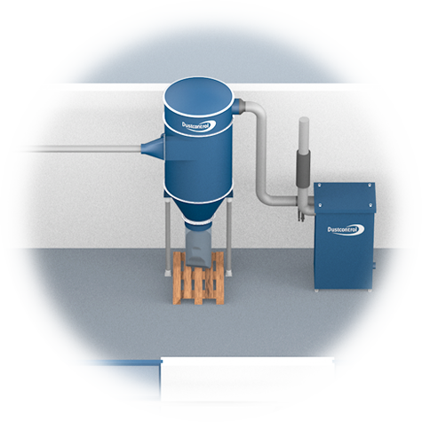 Sugsystemet ska alltid utrustas med stoftavskiljare. Stoftav- skiljaren avskiljer grövre material i cyklon och fint damm i veckade koniska filter som är monterade i cyklonens centrum. Ett veckat filter har mycket stor filteryta i förhållande till sin mantelyta. Stoftavskiljarna kan där ör göras förhållandevis små. Filtren rensas med tryckluftsdriven luftpuls. Detta ger mycket effektiv rensning samtidigt som det är skonsamt mot filtren. Normalt utrustas stoftavskiljaren med plastsäck för uppsamling av det avskiljda materialet, men många andra typer av utmatningar kan monteras.